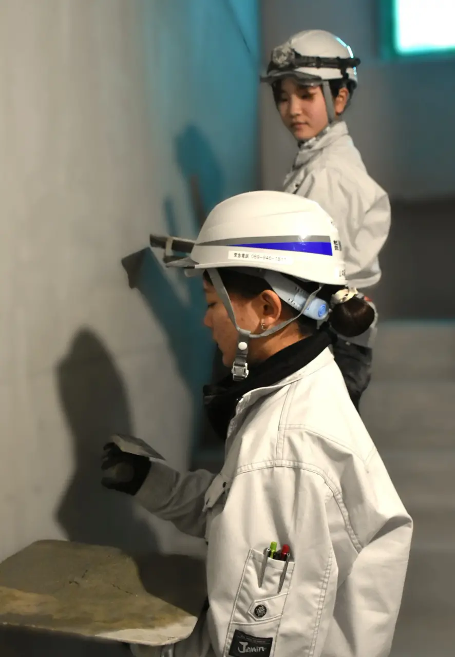 左官の現場では、女性職人が床施工や内外装の仕上げ作業に取り組んでいました。力作業のイメージが強い職人の世界ですが、左官の仕事には繊細さや美しさが求められます。コテを使いながら丁寧に仕上げていく姿からは、「性別や年齢に関係なく、技術で評価される仕事」であることが伝わってきます。