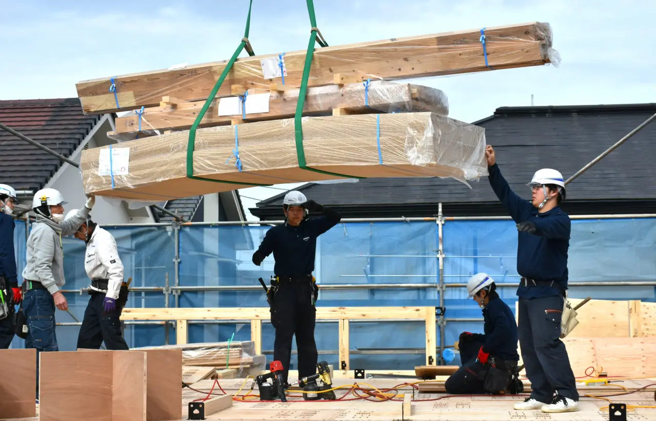 当日は2月の寒い時期でしたが、現場では上棟作業が行われており、若手大工たちが先輩に教わりながら、柱や梁を組み上げていました。声を掛け合いながら作業を進める姿からは、チームでお客様の家をつくっているという空気が自然と伝わってきます。