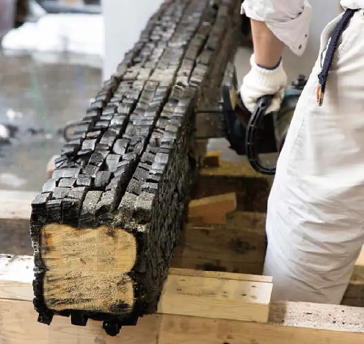 木は表面が炭化すれば内部まで燃え進むことがなく、燃えると想定される寸法を考慮して構造計算することで、万が一の場合も木材が燃えて建物が倒壊することを防ぎます。